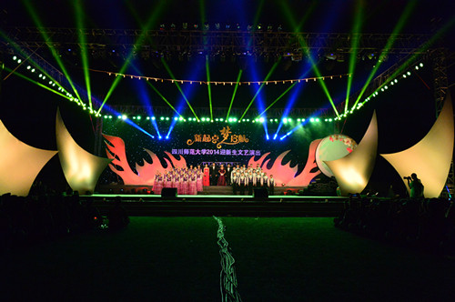 晚会在雄壮的齐唱校歌声中落下帷幕,晚会画上了圆满的句号。在这丹桂飘香,秋风送爽的时节,我校2014级新同学欢聚一堂,谨记“重德博学,务实尚美”的校训,在四川师范大学这个新起点上,为心中的梦想而扬帆起航!