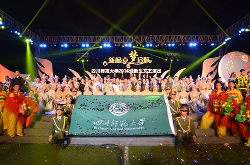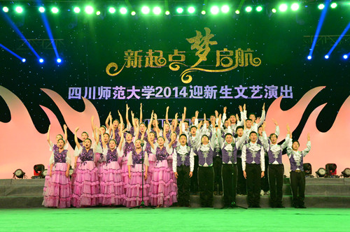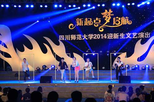 四川师范大学“新起点,梦起航”2014级迎新晚会于9月24日与25日晚分别在成龙校区和狮子山校区举行。校党委副书记2014级学生军训工作领导小组组长王万民、学校副校长2014级学生军训工作领导小组副组长祁晓玲、学校各职能部门负责人、2014级学生军训师领导、承训部队领导及各学院党政领导分别在成龙校区和狮子山校区参加晚会。校领导向全体2014级新生表示欢迎和祝贺,并提出三点祝福和希望:第一、要坚定理想,脚踏实地做人;第二、认真理解领悟校训“重德博学、务实尚美”的含义;第三,尊敬师长,体恤家人,尊师重道;在致辞中校领导分别对两边校区的承训官兵和承训干部表示崇高的敬意,向精心筹备晚会的师生表示谢意。并指出大学的第一堂课是军训,希望同学们认真军训,固话军训成果。