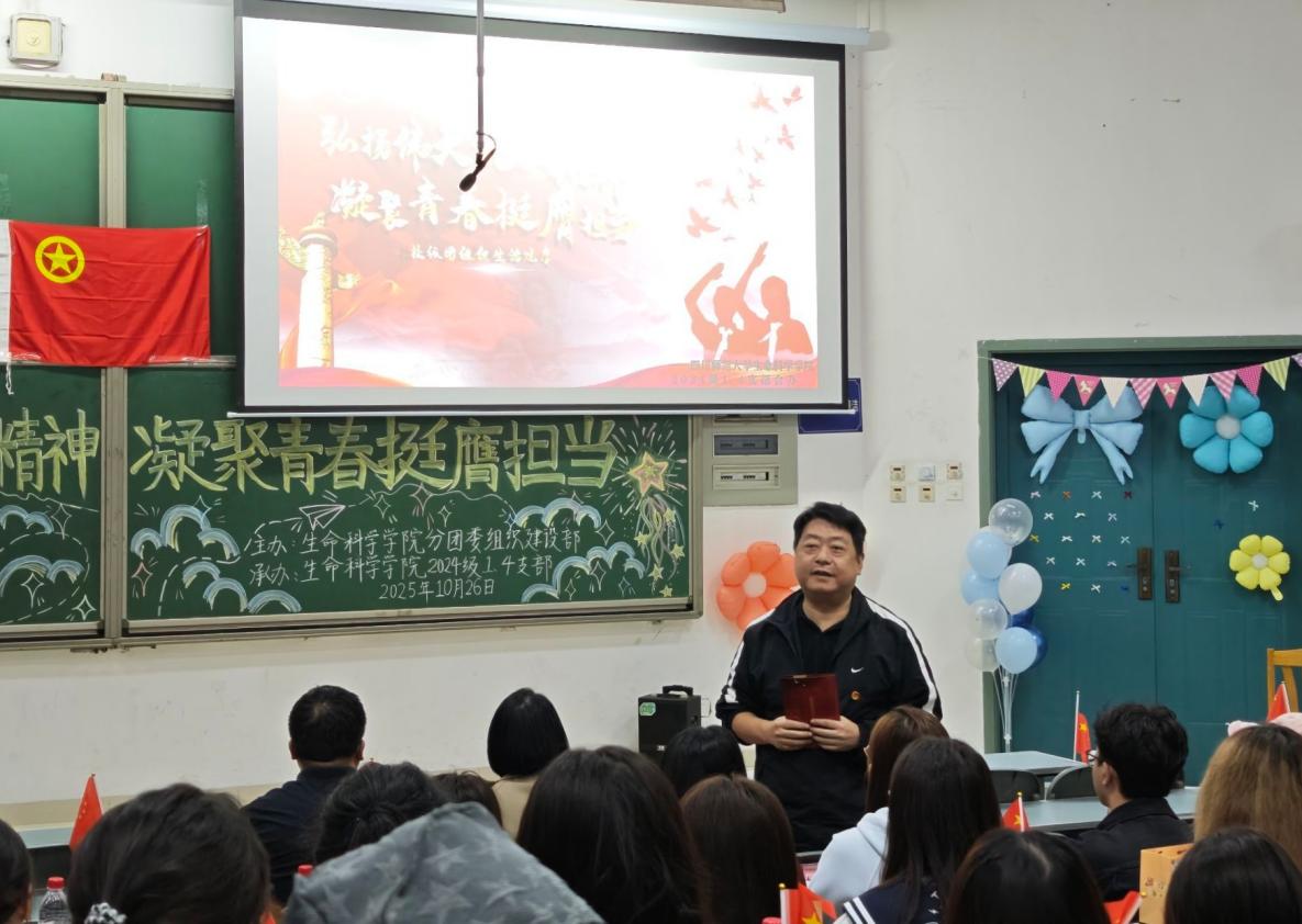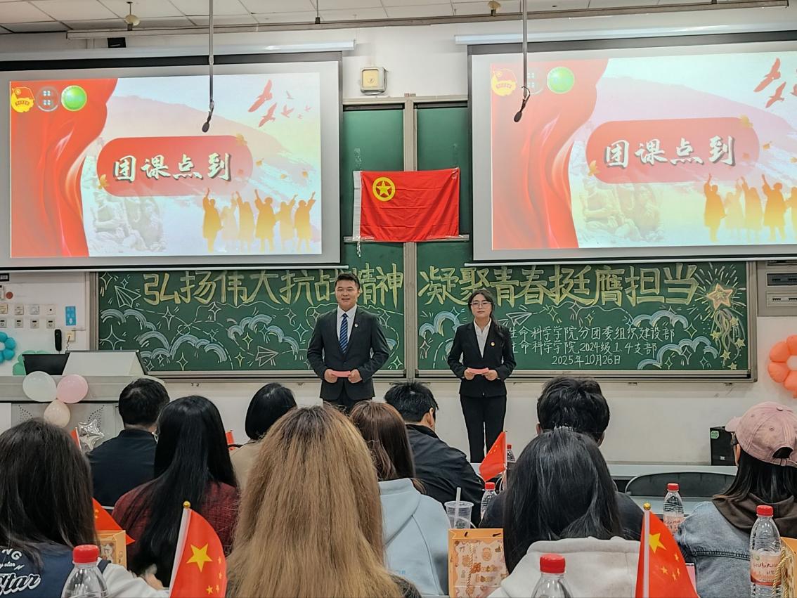 10月26日晚上,生命科学学院“弘扬伟大抗战精神,凝聚青春挺膺担当”校级团组织生活观摩活动在第一教学楼C206教室举行。校团委专职团干毕东,生命科学学院党委副书记、纪委书记代良英,学生工作办公室主任、分团委书记、2024级辅导员卓飞出席本次活动。校团委组织建设部以及各兄弟学院组织建设部代表,生命科学学院学生干部代表、2024级1班和4班全体学生参加活动。