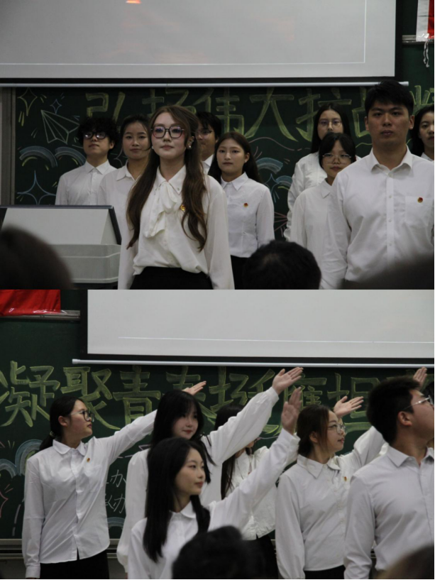 朗诵与合唱《春风作笔,绘新天地》《同心同梦》——声动青春,同心筑梦。朗诵者以铿锵语调描绘新时代的壮阔画卷,合唱团则以激昂歌声诠释“同心同向”的信念。两种艺术形式相互呼应,既展现青年对未来的憧憬,也传递出团结奋进的力量,引发全场共鸣。