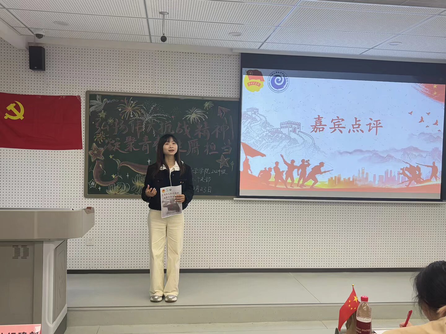 活动在一片掌声中圆满落幕。特邀嘉宾校团委专职团干部曹歆雨老师对本次活动进行了精彩点评。曹歆雨老师表示,本次活动氛围浓厚、策划精心,节目环节紧凑且主线清晰,充分展现特殊教育、小学教育的专业特色。她建议,未来可进一步深挖专业与历史、抗战精神及青年担当的融合点,探讨专业视角下青年行动与国家发展的关联,使活动更臻完善。