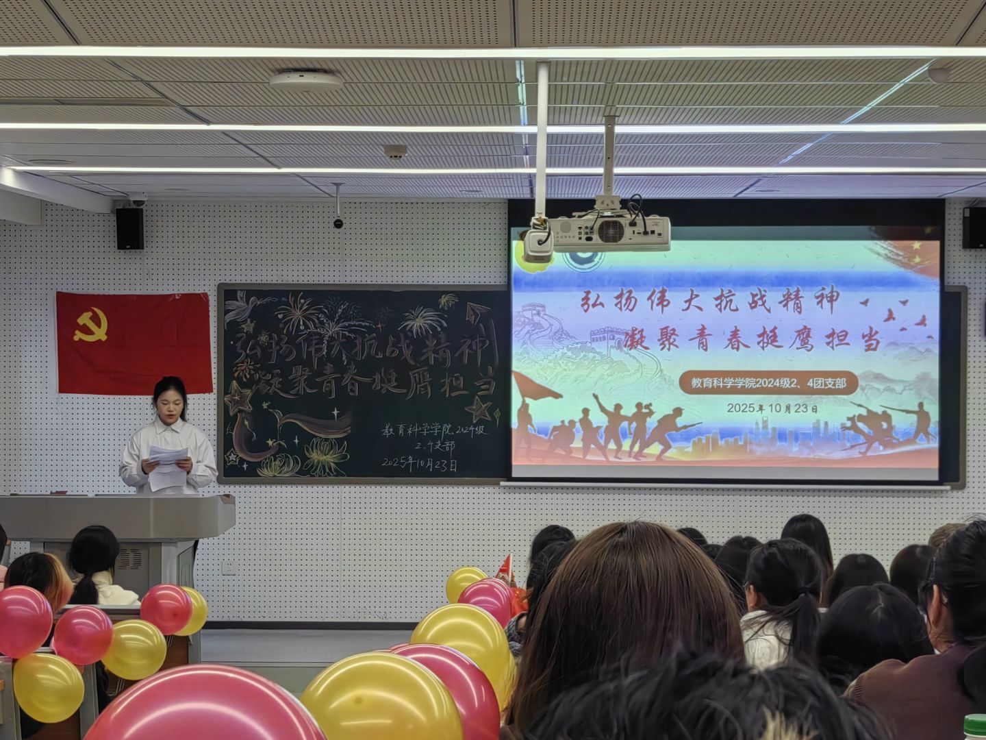 2025年10月23日,由四川师范大学教育科学学院分团委组织建设部主办,2024级二支部、四支部联合承办的“弘扬伟大抗战精神,凝聚青春挺膺担当”校级团组织生活观摩活动,在狮子山校区第二教学楼101教室隆重举行。此次活动旨在深刻领悟伟大抗战精神的核心内涵与时代价值,引导新时代青年赓续红色血脉、勇担时代使命。活动特邀校团委专职团干部曹歆雨老师、2024级学生辅导员陈思琦老师、2025级学生辅导员吴平老师莅临指导。同时,校团委组建部学生负责人及各兄弟学院代表也出席了此次活动。