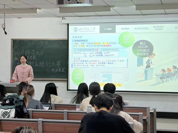 为积极响应国家就业创业部署的具体实践,以“以赛促学、以赛促教、以赛促就”为核心,推动生涯教育落地、破解毕业生就业难题,助力高质量充分就业。2025年11月11日12:30,四川师范大学数学科学学院第十一届大学生职业规划大赛就业赛道院赛于七教206室顺利开展。本次比赛以“筑梦青春志在四方,规划启航职引未来”为主题,由大学生职业发展与就业指导类课程教师张伽伽、董伶俐、代宁、邓也担任评委,一同见证参赛选手们的精彩发挥。